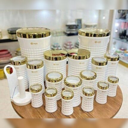 اقلام سرویس 18 پارچه شامل :یک عدد سطل زباله بزرگ پدالداریک عدد سطل برنجیک عدد سطل شکریک عدد سطل قندچهار ظرف برای حبوباتسه عدد ظرف برای دمنوش هاشش عدد ظرف برای ادویه هایک عدد جادستمالی روکابینتی
